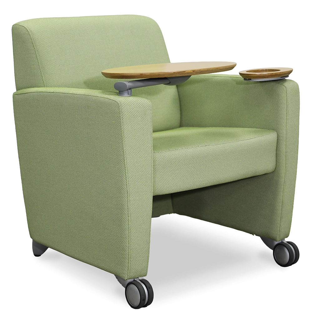 The Haworth ToDo Lounge Chair combines comfort, mobility, and function in a sleek, professional form. Upholstered in a calming sage green fabric, it introduces soft color while maintaining a clean, modern look. The integrated tablet arm provides a convenient writing or tech surface, ideal for collaborative work or waiting areas.