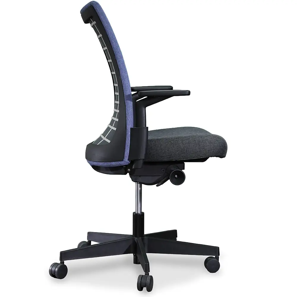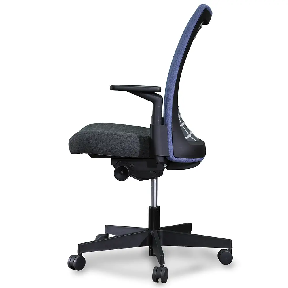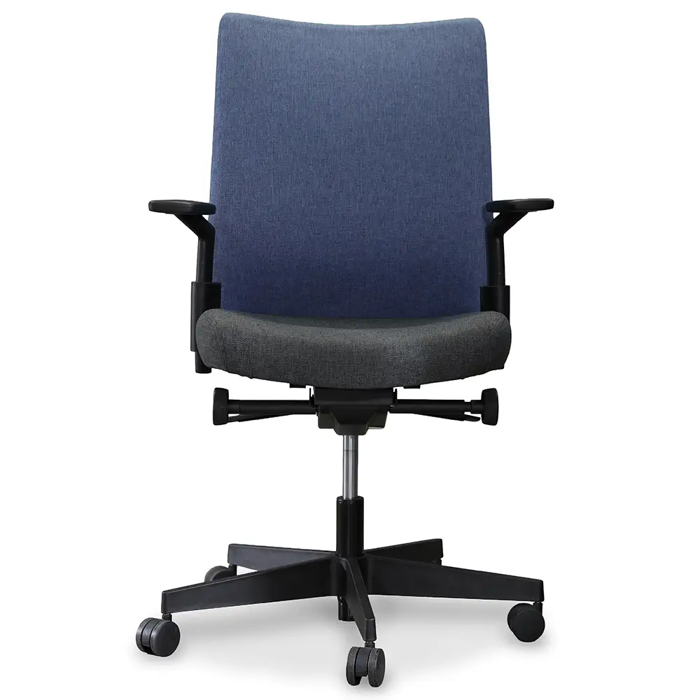 The Knoll Task Chair combines comfort, function, and modern style. It features a medium gray fabric seat and a blue fabric back, adding a subtle pop of color. Designed with a pneumatic lift, seat slide, adjustable arms, and a black tilt lock, this chair supports everyday productivity in any office setting.