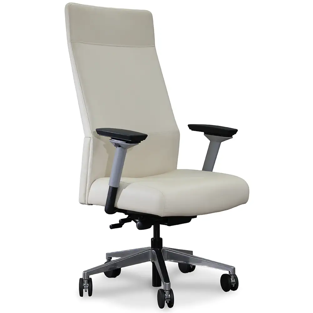 Upgrade your workspace with the Steelcase Siento Executive Chair. Wrapped in an elegant Cream faux leather, it exudes modern luxury. The sleek Platinum base adds a refined touch while the adjustable Black-topped arms ensure personalized comfort. This chair blends sophistication and performance making it perfect for any modern office.