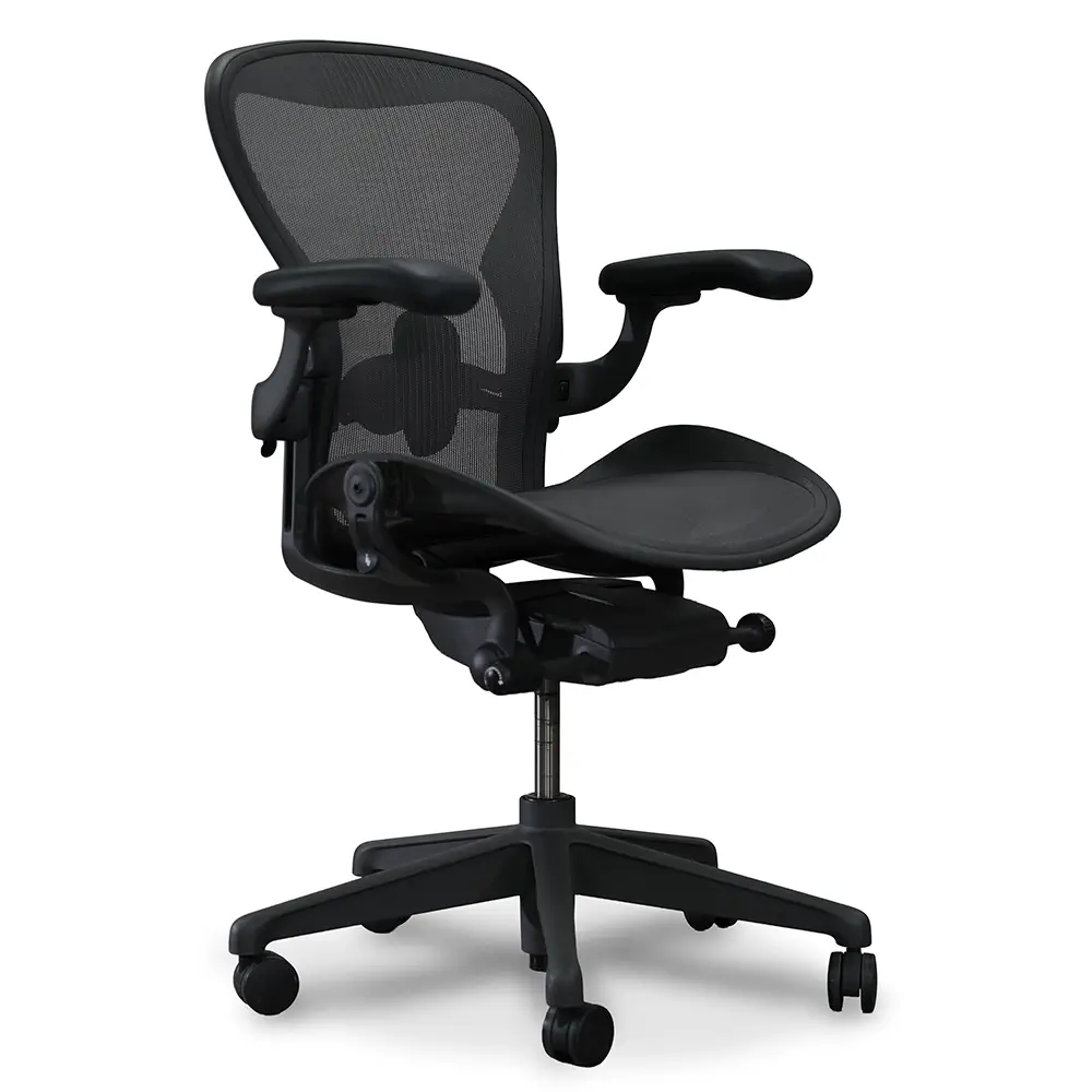 The Herman Miller Aeron Chair delivers ergonomic design and all-day comfort. It features a breathable black mesh back, three paddle controls for easy adjustment, and a sleek supportive frame. Ideal for task-intensive workspaces.